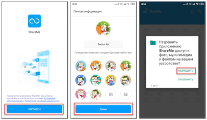 При первом запуске программы система предложит ознакомиться с политикой конфиденциальности и условиями использования. Внимательно читаем информацию и, если вас всё устраивает, нажимаем по кнопке «Согласен». Далее заполняем личную информацию, то есть создаём имя пользователя и выбираем изображение. По умолчанию здесь указывается название модели смартфона и устанавливается первая картинка из списка. Переходим к следующему шагу, нажав по кнопке «Далее».
