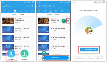 Получателю же необходимо нажать по зелёной кнопке «Получить», а затем предоставить отправителю QR-код для сканирования. Когда соединение между устройствами будет установлено, выбранный файл автоматически начнёт передаваться.