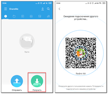 Теперь остаётся со второго устройства зайти в приложение и нажать по кнопке «Получить», а затем с первого телефона отсканировать расположенный на экране QR-код.